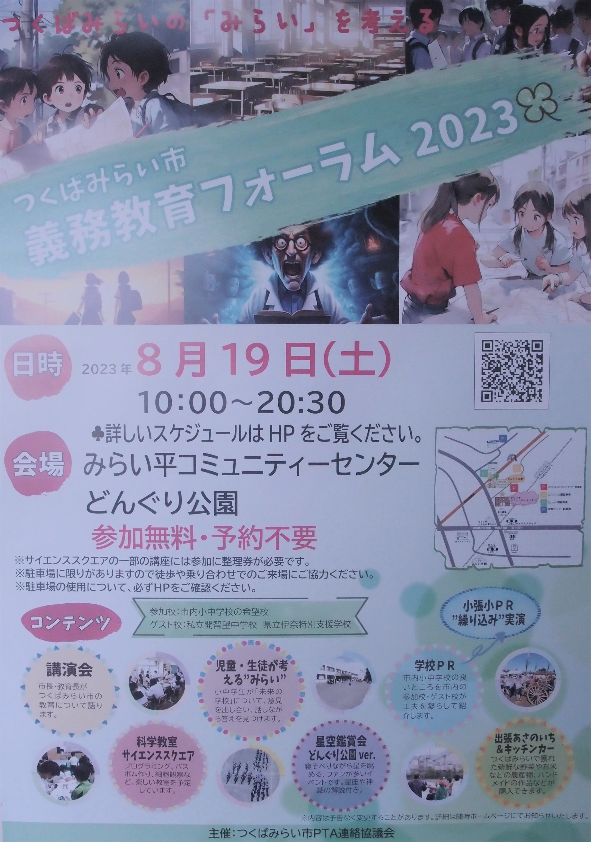 (2023.7.31)つくばみらい市義務教育フォーラムポスターをアップしました。生徒の作業製品、学校紹介ポスターを展示する予定です。ぜひご覧ください。